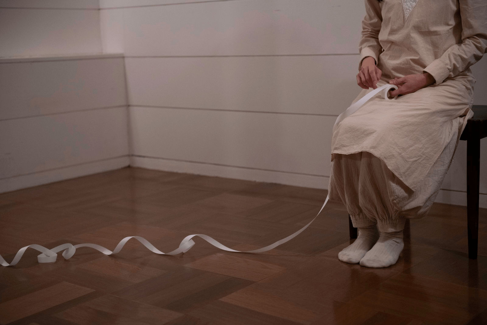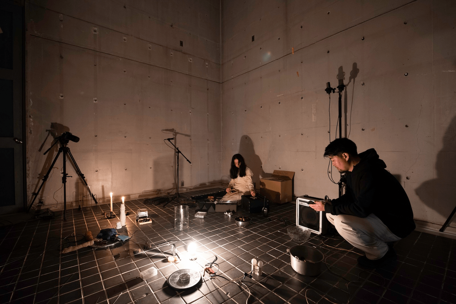 Artist: 跡の前(嶺川貴子+川口貴大)[2023年3月に行ったセッションの中で、嶺川からふいに発せられた物語の断片の様な言葉をきっかけに継続/発展させてみようと名前を付けたグループ。ステージは設けず、川口の自作楽器とその日に持ち込まれた様々な物を介し、会場のどこかで何かが降り積もっていくパフォーマンスを試みている。